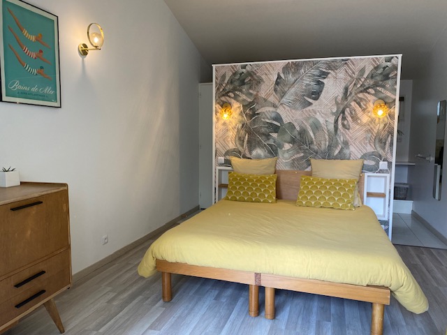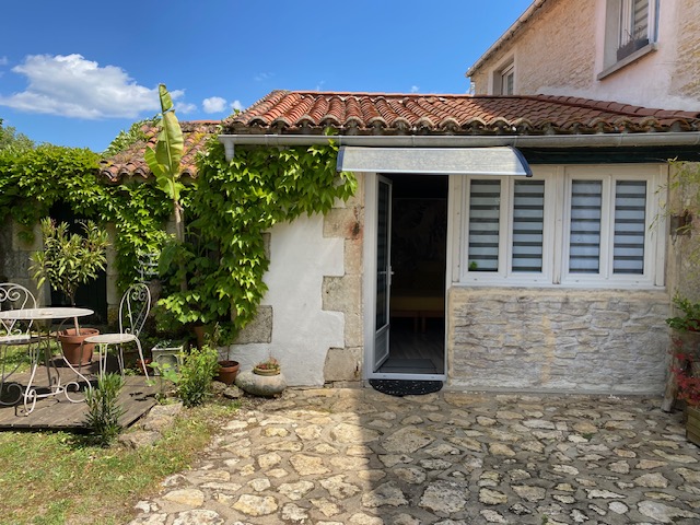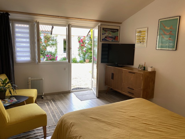 1 slaapkamer voor 2 personen, gelegen op de begane grond van een bijgebouw, met bed van 160 cm x 200 cm en zithoek.