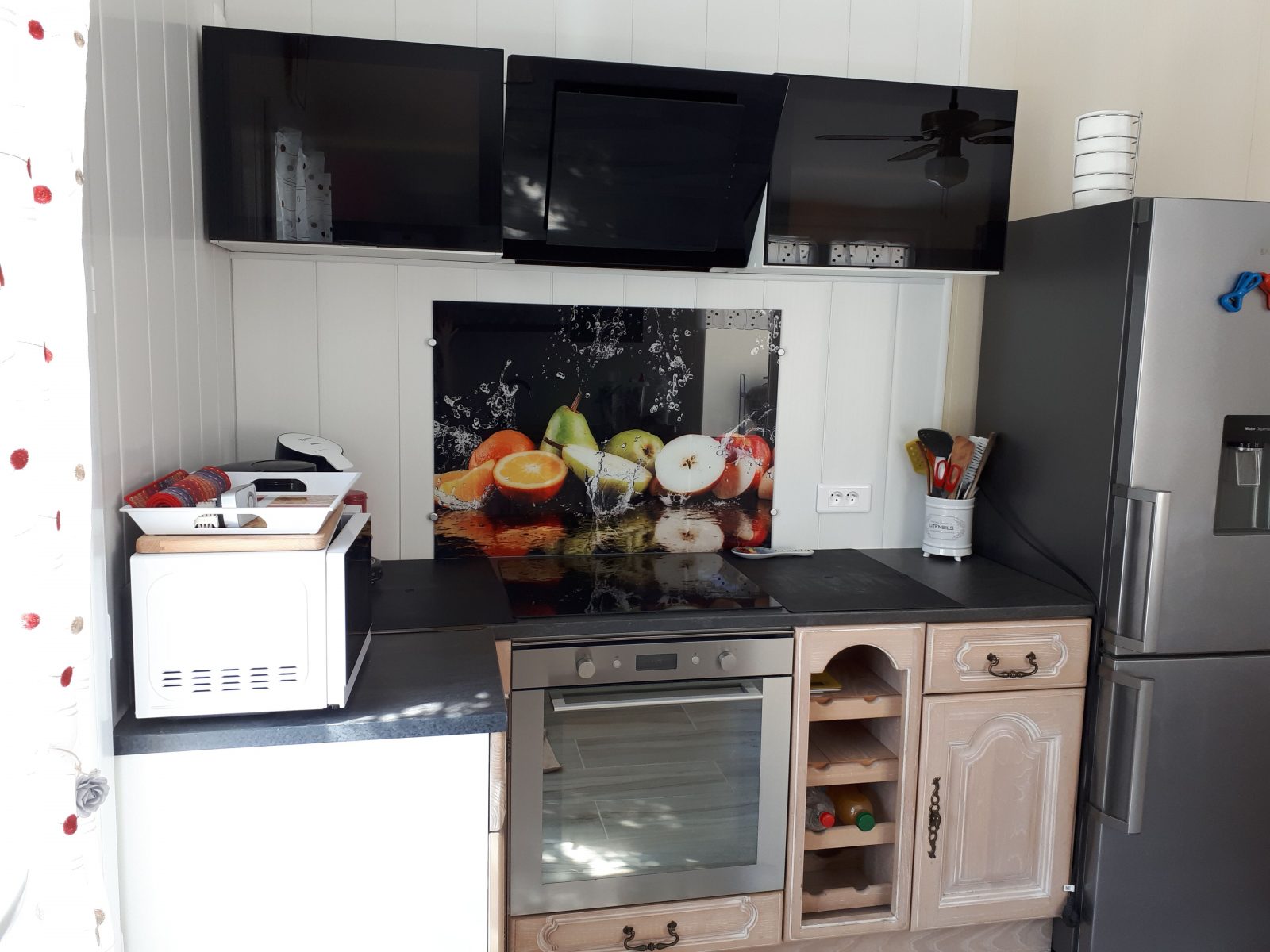 Een grote kamer + keukenhoek, met sofa, gootsteen met één bak en warm water, koelkast/vriezer met dispenser voor vers water, 4-pits inductiekookplaat, elektrische oven, magnetron, wasmachine (5kg), vaatwasser, elektrisch koffiezetapparaat + Senséo koffiezetapparaat, opbergkasten, tafel, stoelen, huishoudelijke apparaten, stofzuiger, strijkplank en strijkijzer, serviesgoed en keukengerei, 80 cm flatscreen TV, radio, mini-boekenkast, strips, gratis Wi-Fi, plafondventilator.