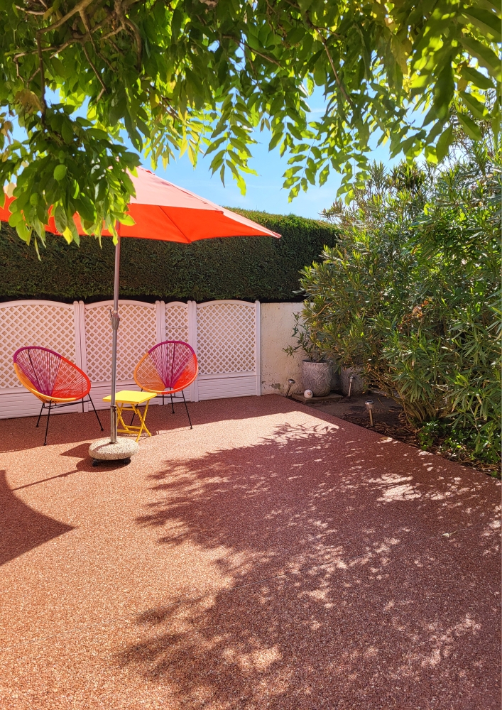 Een terras aan de voorkant van het huis met tuinmeubilair en parasol,