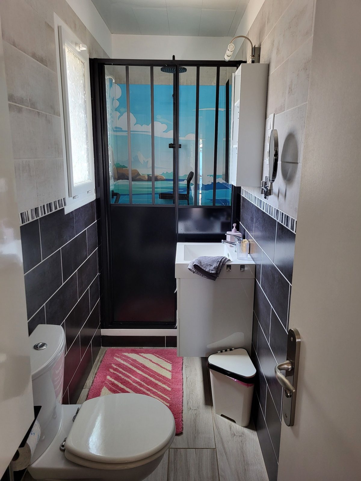 Een badkamer met warme hydromassagedouche, wastafel, wc en opbergruimte.