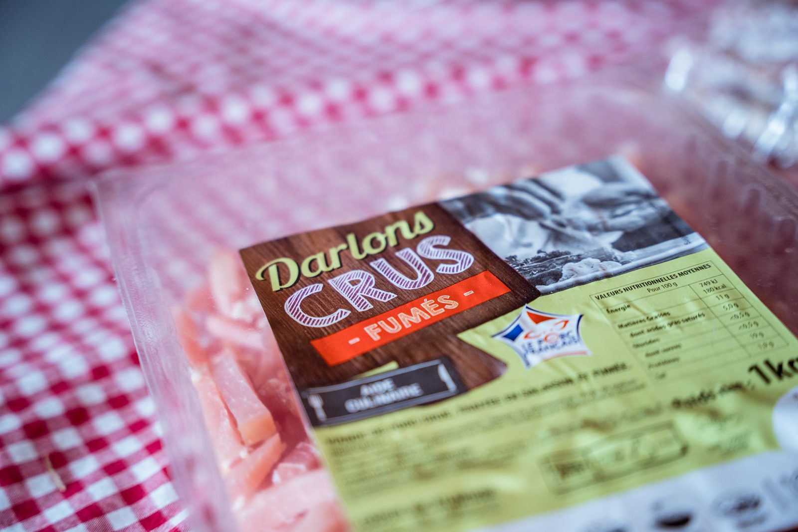 Pakketten varkensvlees en vleeswaren van de boerencoöperatie en zelfbediening in de winkel.