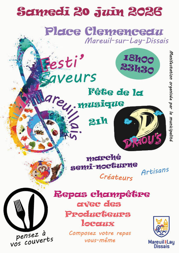 Het Mareuillais Festi'saveurs is een halfnatuurlijke markt met lokale producenten en creatieve ambachtslieden. Kom je eigen maaltijd samenstellen: rundvlees, varkensvlees, kip, oesters, groenten, mosselen, kant-en-klaarmaaltijden, desserts... en geniet ter plekke van een plattelandsmaaltijd. Dit wordt gevolgd door het Fête de la musique vanaf 21.00 uur.