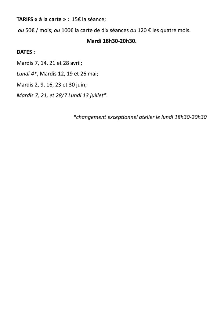 - Tarief per volwassene : 50,00 € - Tarif par mois (4 séances)