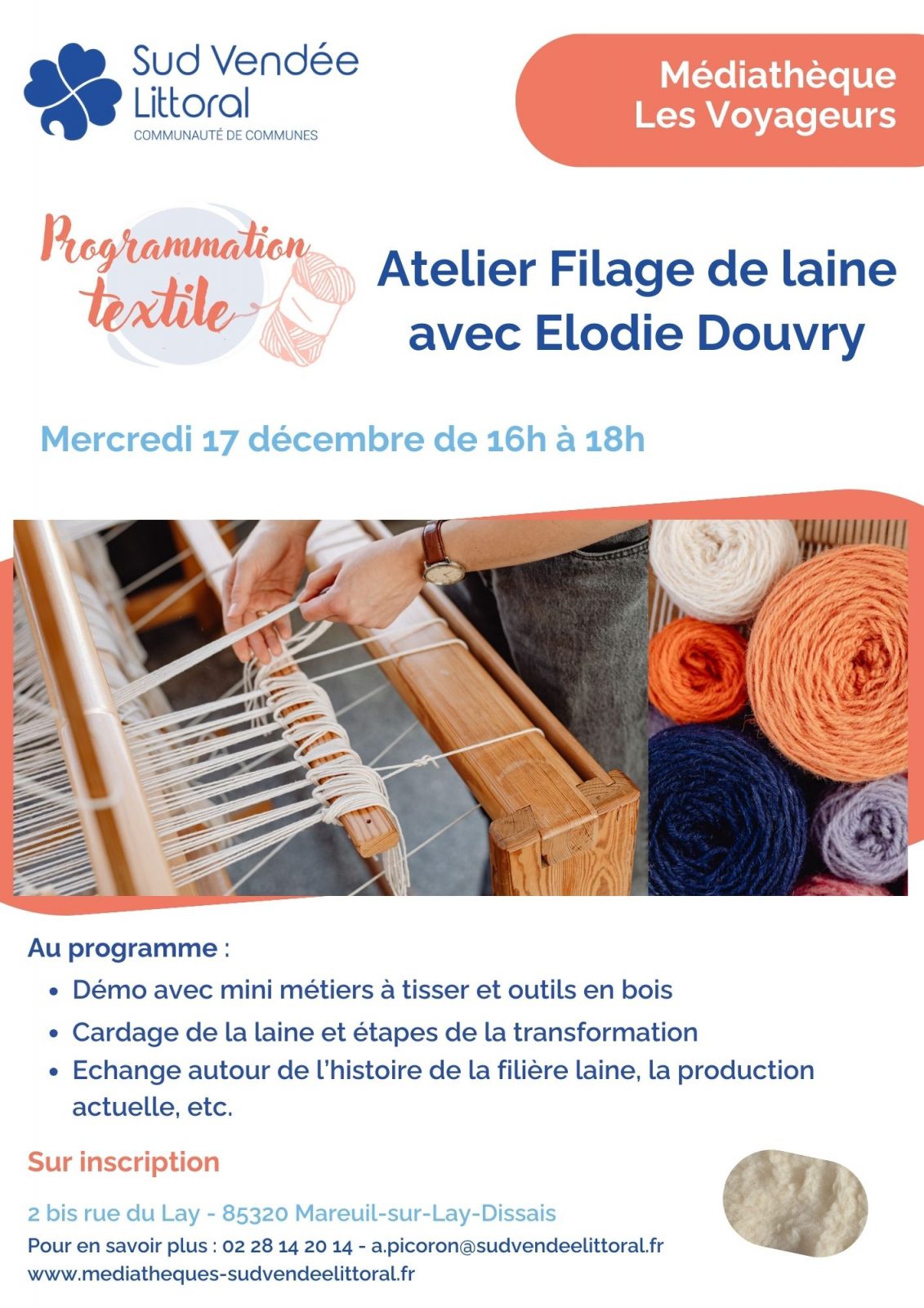 In het kader van het textielprogramma van de mediatheken Sud Vendée Littoral nodigt Elodie Douvry je uit om een tijdje wol te spinnen.