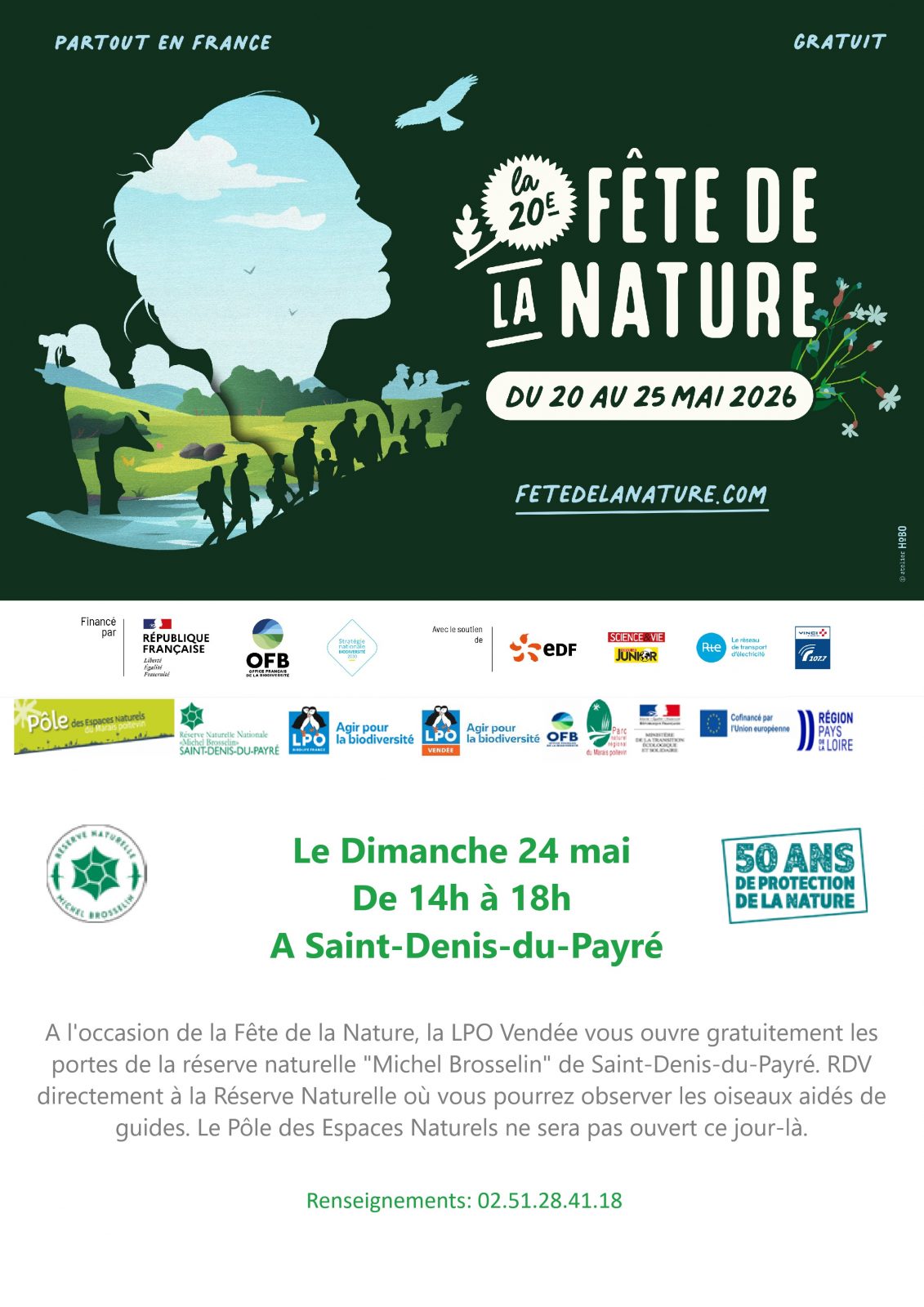 In het kader van het Fête de la Nature opent LPO Vendée gratis de deuren van het natuurreservaat "Michel Brosselin" in Saint-Denis-du-Payré. Kom direct naar het natuurreservaat, waar je de vogels kunt observeren met behulp van gidsen. De Pôle des espaces naturels is deze dag niet geopend.