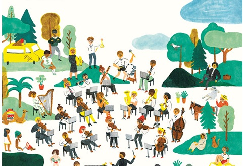 Rampzalig! Het concert is over een week, maar alle muzikanten zijn op vakantie: de violist naar Tokio, de harpist naar Porto, de trompettist naar Rio, de fluitist naar Abidjan. De dirigent moet ze gaan zoeken, waarbij hij de ansichtkaarten die ze hem hebben gestuurd als aanwijzing gebruikt.
