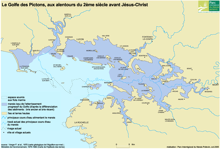 Eerste onthulling: de Golfe des Pictons! Bij het zien van deze kaart wordt het duidelijk dat de Marais poitevin 6.500 jaar geleden een groot bassin was, gevuld met oceaanwater. Alléén een paar eilandjes staken er bovenuit. De mens heeft zich in de loop der eeuwen als eerste op deze voormalige eilandjes gevestigd, om er zeker van te zijn dat ze droog zouden zitten (best slim, toch?). Het dorpje Chaillé-les-Marais is één van deze voormalige eilandjes.