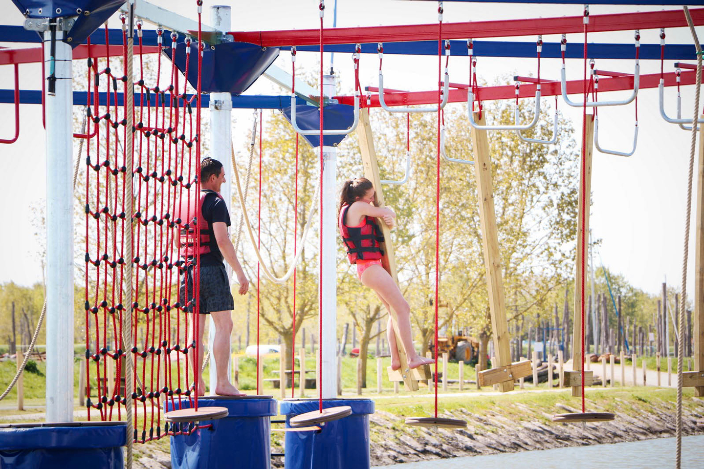Waaghalzen kunnen op het meertje van L’Aiguillon-sur-Mer ook kiezen voor het touwenparcours van Warrior Game! Bij dit voor Frankrijk unieke parcours draait het om kracht en evenwicht. Netten, schommels, ringen, touwen met knopen: daag jezelf uit! Probeer één van de vier parcoursen, elk niveau heeft een andere kleur. Lukt het je om een parcours af te maken?
